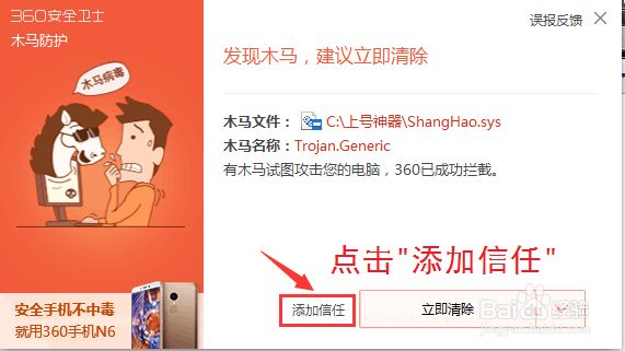 1.如果你只安装了360安全卫士,弹出了如下的窗口,点击"添加信任"按钮即可。