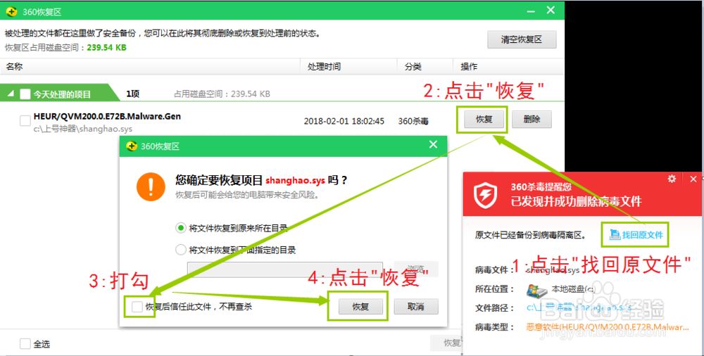 2.如果你还安装了360杀毒,弹出了如下的窗口,那么请依次点击"找回原文件"、“恢复”、