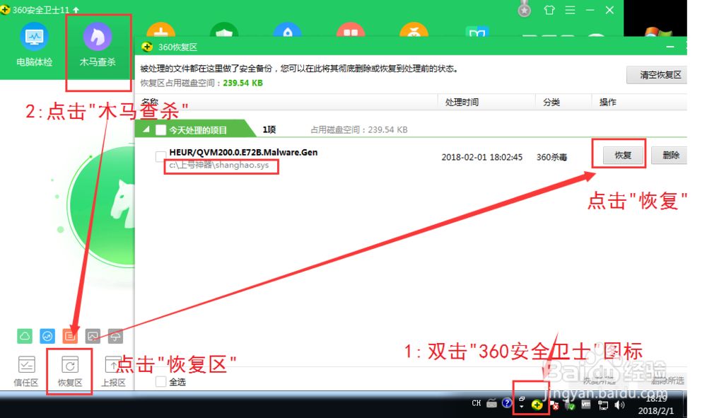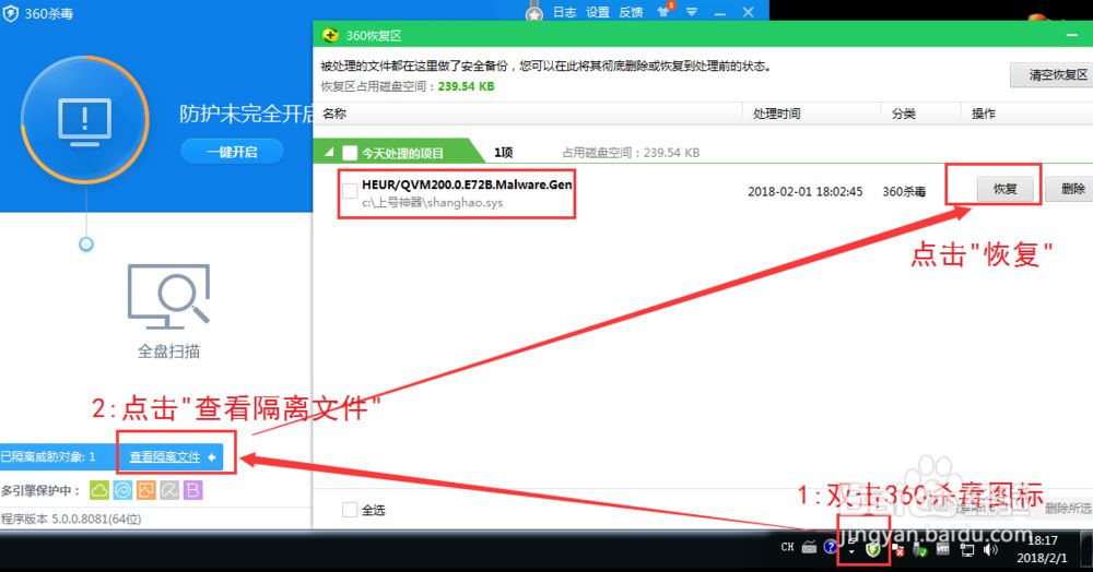 3.如果你错过了操作时间,你还可以到360杀毒或者360安全卫士的隔离区里面手动恢复文件,